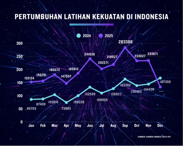 Strength training meningkat 29% secara global, menandai tahun keempat berturut-turut pertumbuhan di atas 20%. Di Asia, peningkatannya mencapai 27% dan untuk pertama kalinya menyalip aktivitas bersepeda sebagai olahraga tiga besar. Indonesia mencatatkan 65% pertumbuhan latihan kekuatan, yang menjadikannya tiga besar dalam olahraga terpopuler di tahun 2025 dengan 2,367,843. Hal ini menunjukkan bahwa masyarakat semakin peduli membangun fondasi kekuatan untuk mendukung performa jangka panjang.