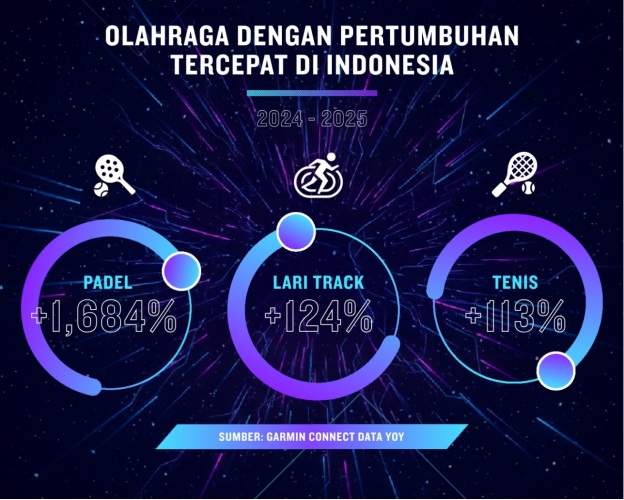 Laporan tahun ini juga memperlihatkan tingginya popularitas padel sebagai salah satu olahraga dengan pertumbuhan tercepat di Indonesia dengan peningkatan aktivitas pengguna Garmin sebesar 1.684% dibandingkan tahun sebelumnya. Disusul oleh track running dengan peningkatan 124% dan tenis sebesar 113%.