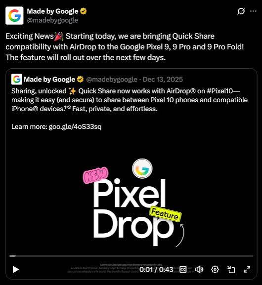 Seri Pixel 9 menjadi lini pertama yang menerima peningkatan Quick Share dengan kemampuan kompatibilitas transfer lintas ekosistem secara lebih luas. Pembaruan ini menjadi bagian dari strategi Google untuk meningkatkan daya saing perangkat Pixel di pasar premium global.